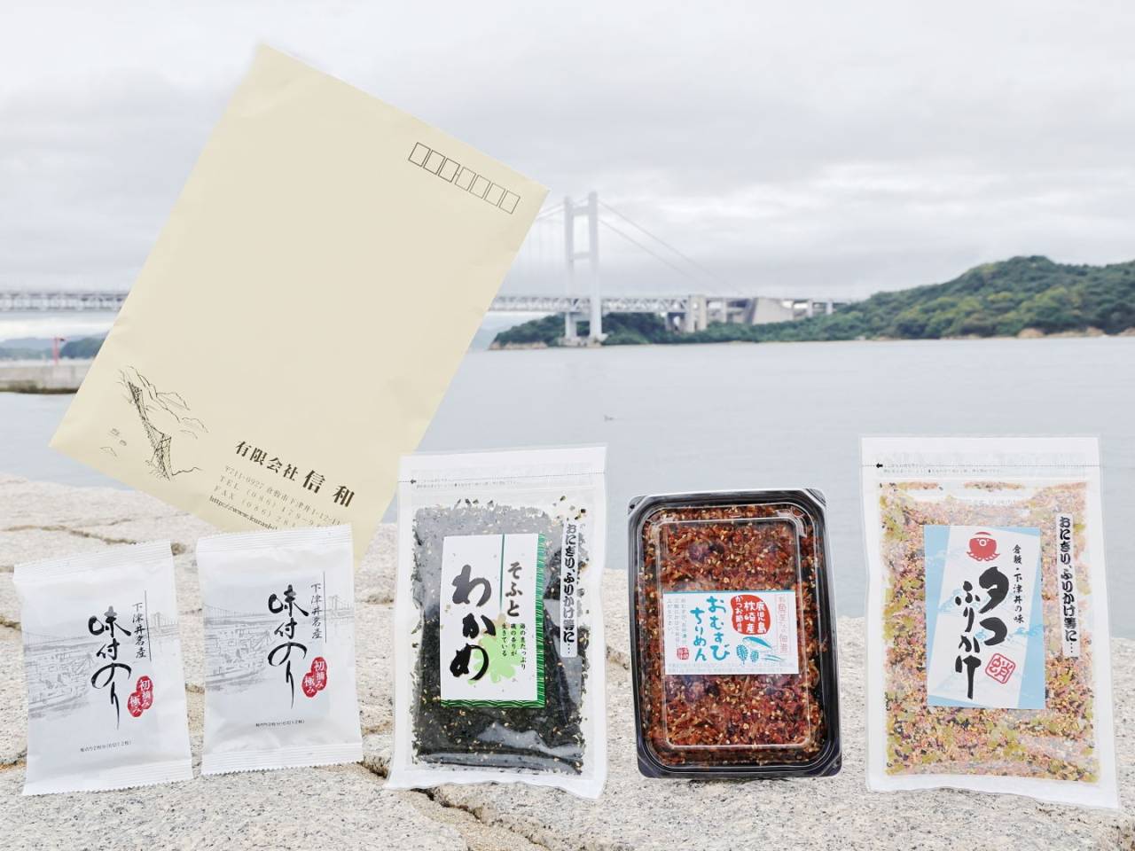 下津井産味付のり・2袋: そふとわかめふりかけ・80g: おむすびちりめん・65g たこふりかけ・80g